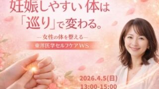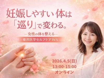セッション&セミナー 【4/5(日)9時まで!】 2026年4月3日 kaori 現在、お申し込み可能なメニューはこちらです。 【4/5(日)zoom】妊娠しやすい体は「巡り」で変わる。女性の体を整える東洋医学セルフケアWS へのお誘い こんにちは …